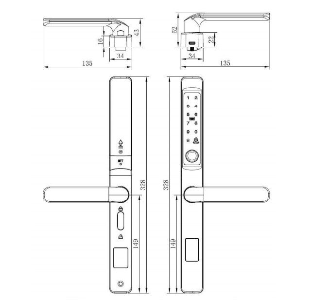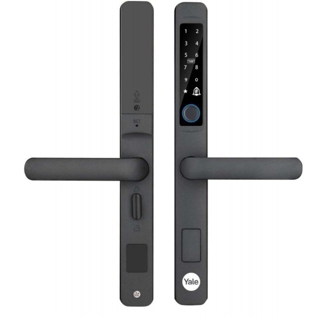 Khóa điện tử Yale YDMA 100NP cho cửa nhôm, cửa đố nhỏ, backset 34.5mm, mở cửa bằng vân tay, thẻ từ, mã số, chìa cơ. Hoàn thiện màu đen nhám